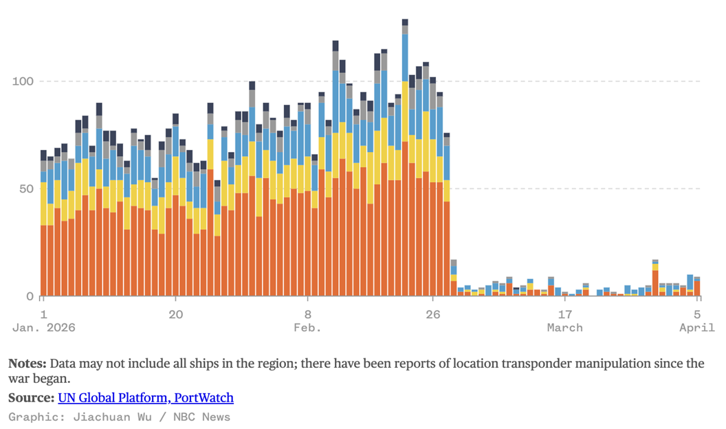 It’s unclear if, when this reaches you, the Strait of Hormuz will be “opened” or “closed,” though even this framing is a bit reductive. A significant barrier to restoring a normal volume of shipping through the narrow channel is a financial one – insurance – rather than just a physical one. Regardless, even if normal traffic through the strait is restored by the time this lands in your inbox, analysts widely agree that supply disruptions, both from the closure and from damage to energy infrastructure in the Middle East, will have significant economic repercussions for months if not years.