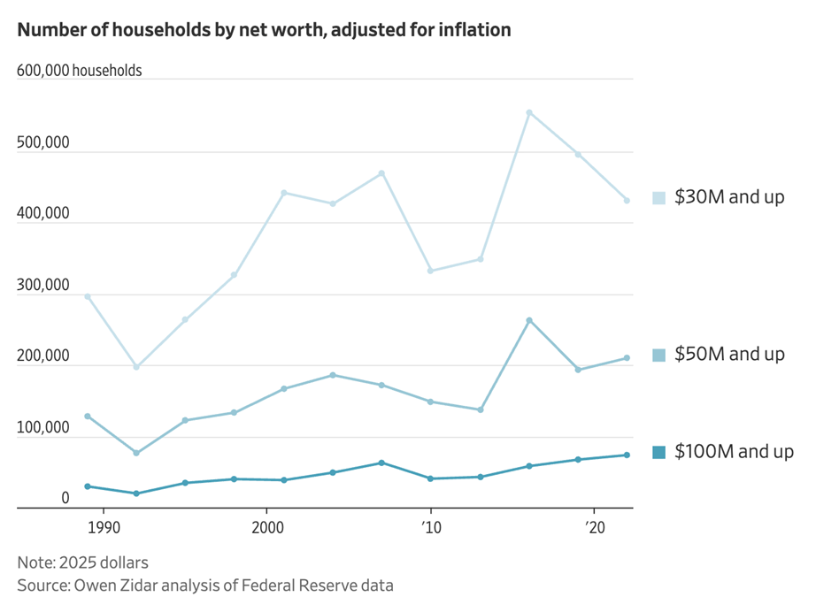 Meanwhile, in the latest data point supporting the “K-shaped” economy narrative, recent analysis of Federal Reserve data show the number of ultra-wealthy households in the U.S. is rising. About 430,000 are worth $30Mn or more, a sharp increase vs. the 1990s. The wealthiest, whose net worth is primarily driven by assets, rather than employment income, have benefited from rising values across asset classes, including real-estate, businesses they own, and the stock market. With U.S. consumption increasingly driven by a smaller but wealthier segment of consumer, retailers and service providers looking to grow are looking to cater to this demographic.