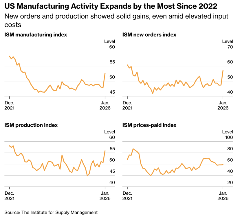 January’s payroll numbers disappointed. The latest ADP private payroll data showed an increase of just 22,000, far below analyst estimates. The January numbers follow a downward revision to December’s stats, contributing to a growing sense of a slowing job market that many are continuing to describe as “low hire, low fire.” In better news, manufacturing activity grew at its fastest rate since 2022, according to a new report. The latest ISM index rose to 52.6 from 47.9, indicating growing activity in the sector. New orders also jumped in the January data. However, the data also show that manufacturers are facing higher input costs, with the prices-paid index increasing to its highest level in four months.