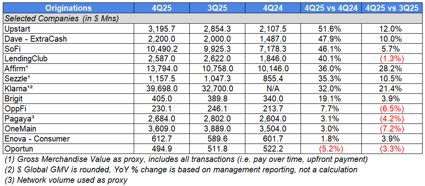 In the fourth quarter, lenders continued to report strong YoY growth in originations across lending products (BNPL, cash advances, higher-APR (36%+ APR) loans, personal loans). Consumer demand for credit remains strong, with aggregate household debt hitting a record high of $18.78Tn in Q4, per New York Fed data.
