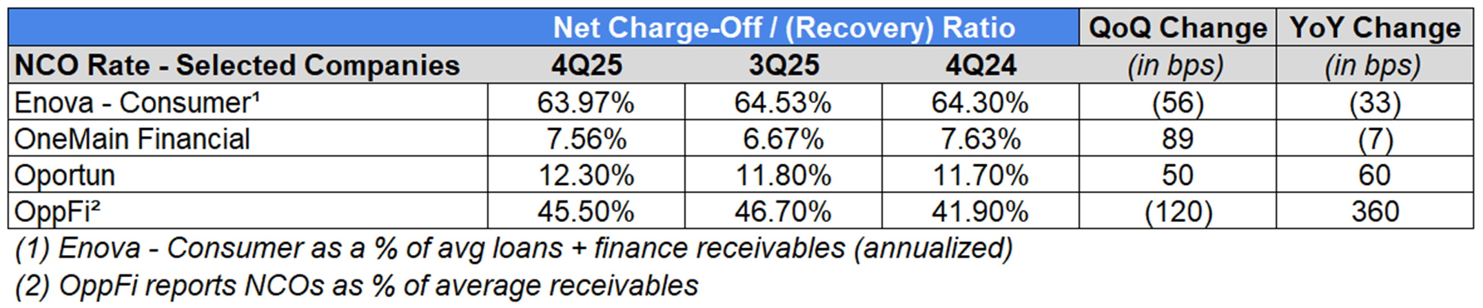 Enova, which lends at a higher APR and serves a clientele more prone to delinquency, reported an improvement in its NCO ratio, down (33)bps YoY. To note, Enova saw minor elevated default metrics in Q2 and tightened credit models for its consumer products.