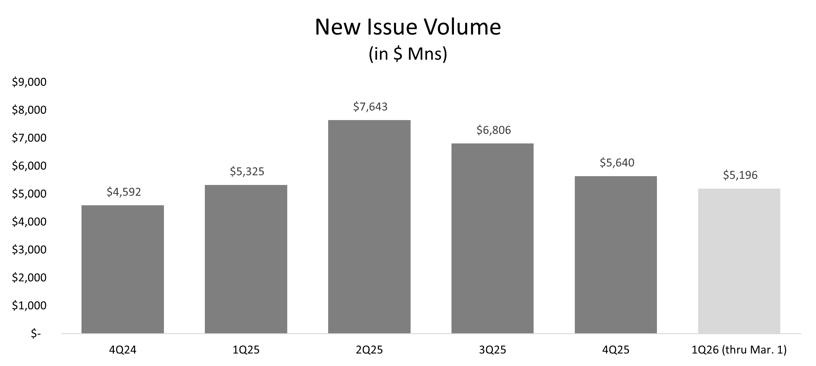 2026 volumes are on pace to post substantial YoY growth. Through February, new issue volume was $5,196Mn, already nearing full 1Q25 levels ($5,325Mn).