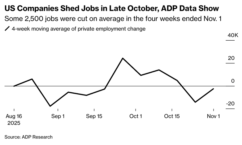 Initial jobless claims jumped last month, hitting 232,000 for the week ending October 18th, according to Bureau of Labor Statistics data. That’s up from the 219,000 applications for the week ending September 20th and higher than analysts had expected. Continuing claims edged up to 1.957MM. There are still gaps in BLS’ data owing to the lingering impacts of the government shutdown. Meanwhile, data from payroll provider ADP shows that U.S. employers were eliminating about 2,500 jobs per week in October. Survey data show that Americans are growing increasingly concerned about employment stability, with a recent Harris poll showing 55% of workers are worried about losing their job.